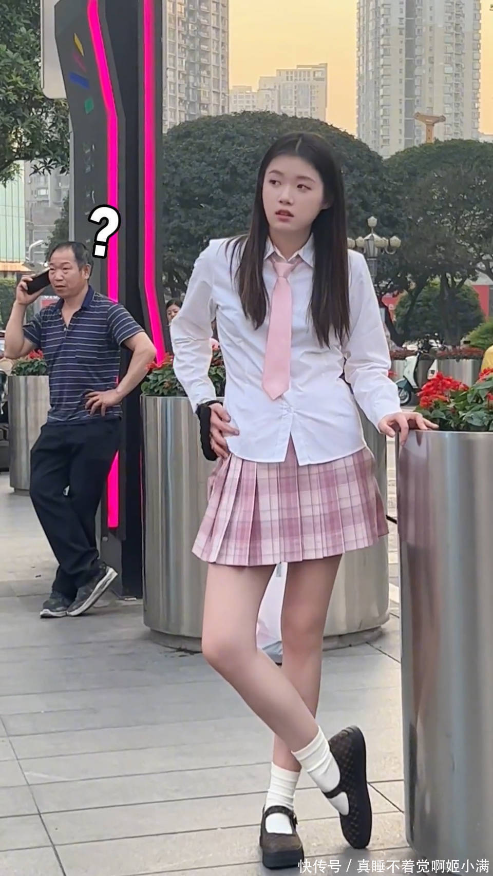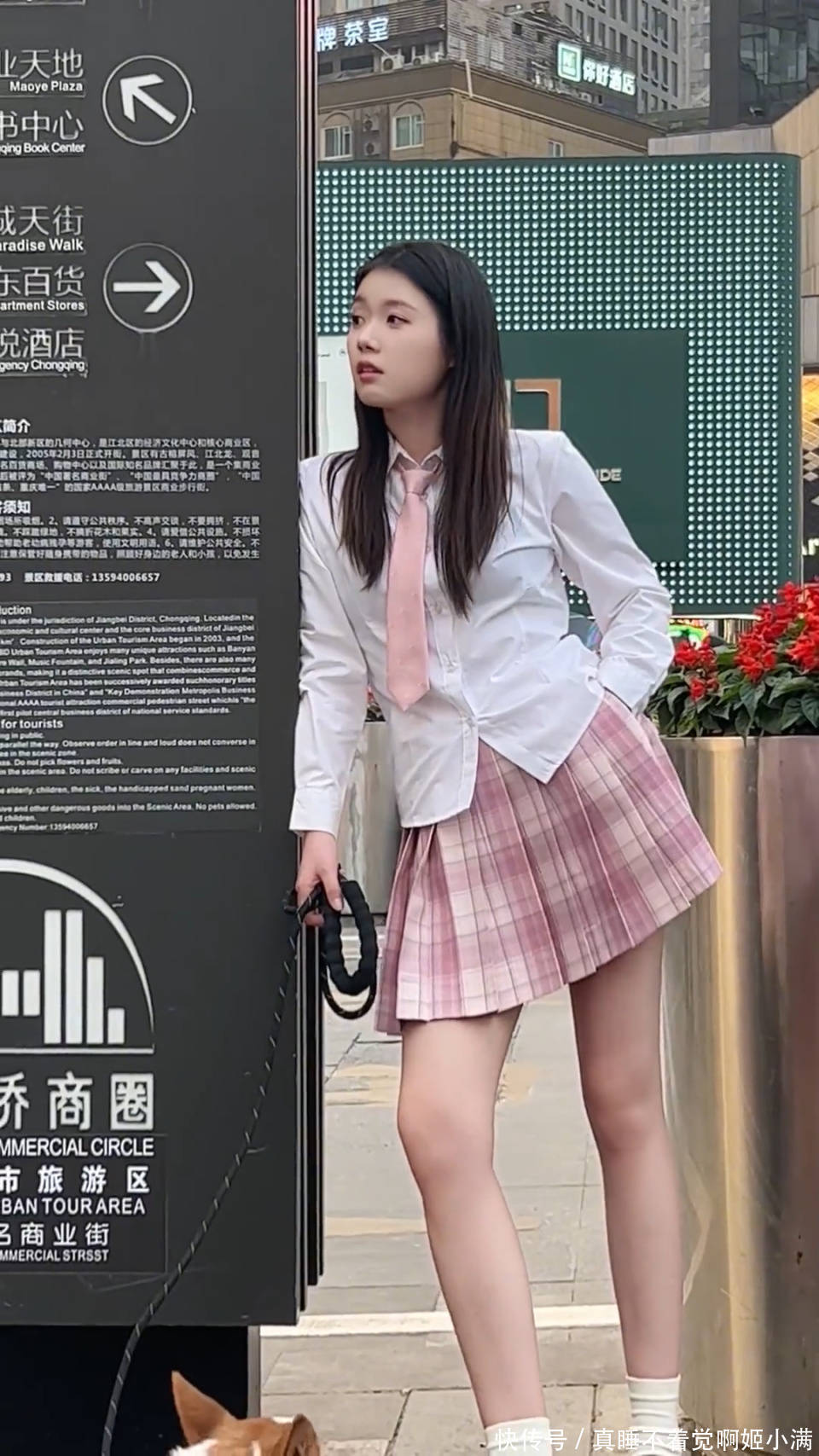 视频画面中这位女孩上身穿着白色衬衫打着粉色领带,下身搭配着粉色格子裙,露出白皙的长大腿,不仅凸显出窈窕的身材,而且浑身还散发出了清纯可爱的气息,可之后女子的举动则是令画风突变。
